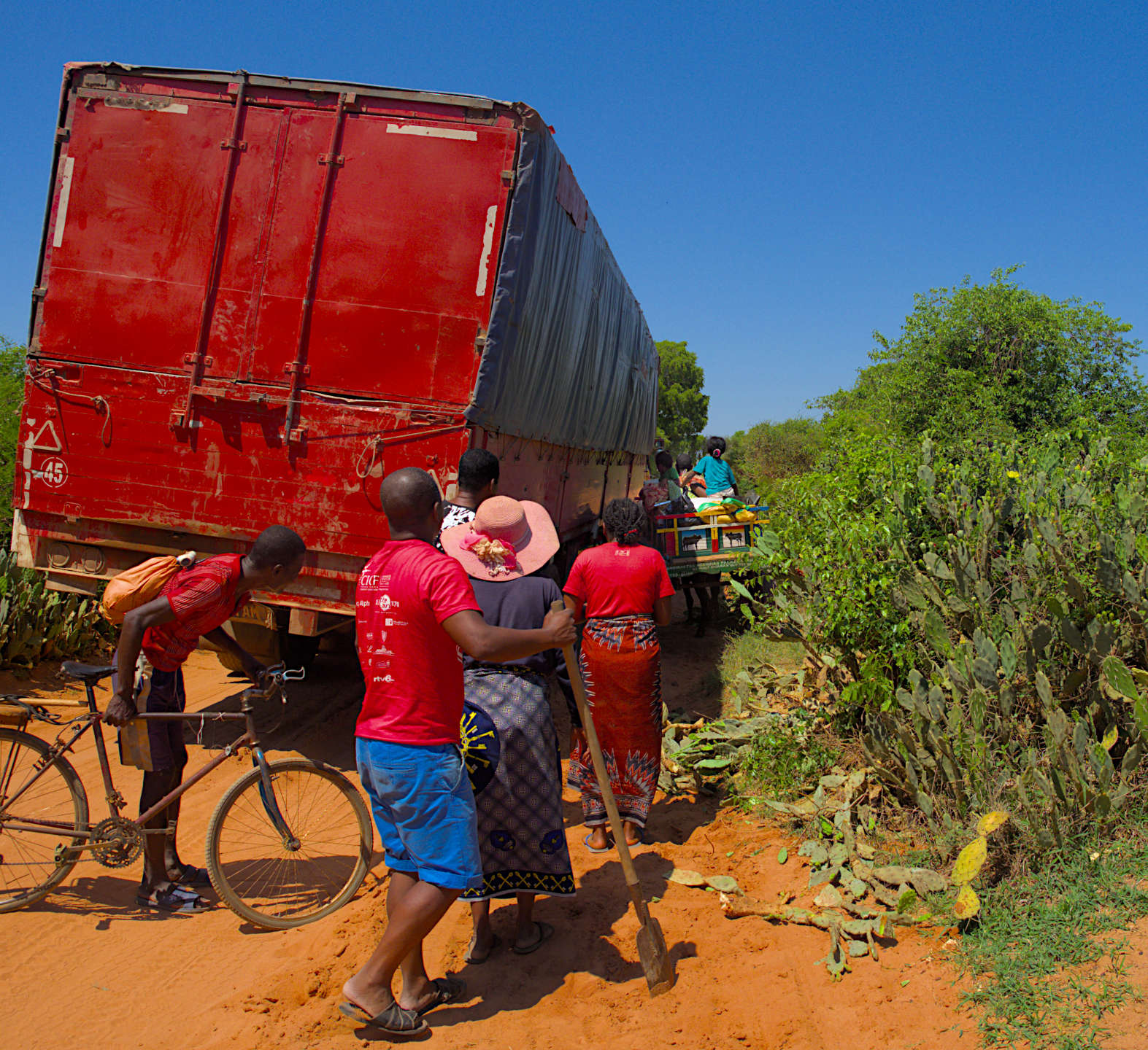 In the middle of nowhere we came upon a truck blocking the road. It had some kind of drive train / gear trouble, and wasn't going to be moved anytime soon. So Caesar got out his tools and started cutting back the cactus, sisal, and other stuff so we could get around it.