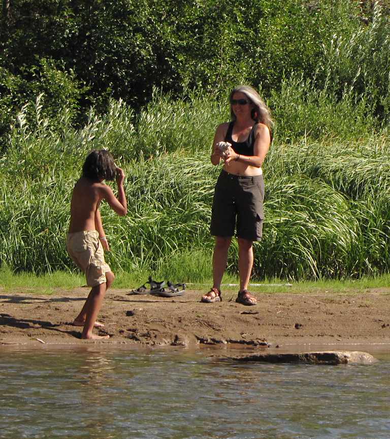 Zia was a little apprehensive at first about swimming across the current, so I explained to her (or tried to explain to her) about the different currents and how she would be carried downstream while she was swimming, and that that was ok. I showed her how to start higher up so she would have a little more room. "Swim towards the side of the river, not the people you want to reach; just keep heading for the side, and you'll make it." When she first started across I thought she would be too timid about it, but with everyone cheering encouragement she went for it and did fine.