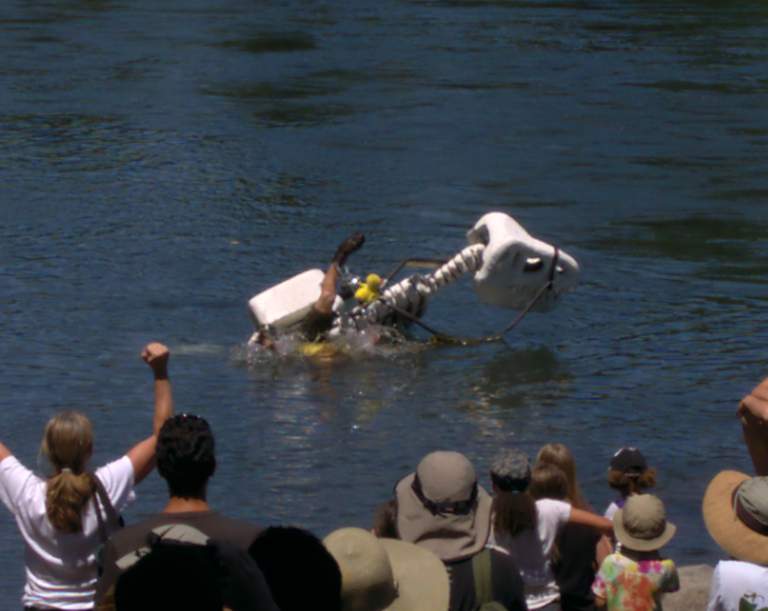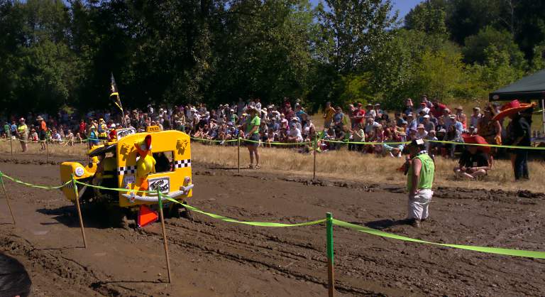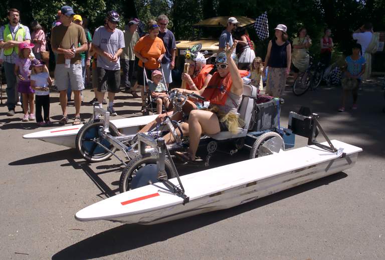 "Racers must ride over 10 miles of city streets, over a man-made sand dune, across 3000 feet of sun-dried, clay pasture, through 200 feet of deep, thick, sticky mud, and down 2 miles of the Willamette River. All of this under pedal power with no help from their friends (or spectators)!"