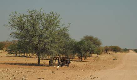 After we left Etosha National Park we headed for the town of Kamanjab. As soon as we left the park we entered a land of game farms. The roads were straight as an arrow through the bush, with high game fences on both sides. Apparently it was pretty much sub-divided into small private landholdings -- it felt like a magazine promoted real-estate development, like houses "close to the mountains" in Arizona. There was a fence with a gate crossing the road just about every kilometer, which made travel slow. I used the stops to scan for birds and wildlife wild Dona dealt with the gates.