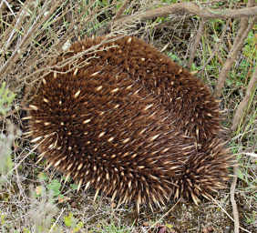 Then we headed south across the central highlands which we had traversed before. Along the way we found another echidna, so we slammed on the brakes. I got some gloves out of the trunk to try to pick it up the way Frapps had, but I was foiled. As soon as I approached the echidna tucked its nose and dug in with its claws. I was able to hold it by the sides, but I felt if I pried it loose from the ground I might strain its muscles or stress it too much, so I left it alone. It was really dug in.