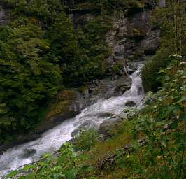 After a fair bit of uphill work, we came to a big waterfall-filled cirque with Rob Roy Glacier hanging over everything. About all we could see of the glacier itself was the terminus, but we got a great view of the waterfalls. We got narry a glimpse of Mt. Aspiring. Pooey! Some other time... I suspect it is pretty spectacular on the two days a year when the sun is shining ;-)!